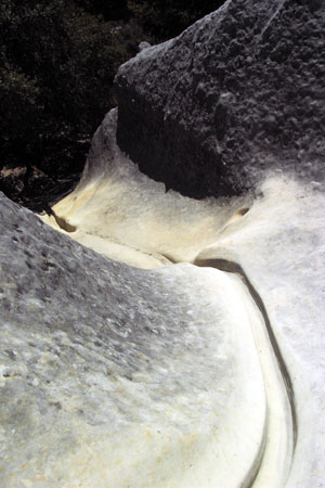 This was kind of an interesting discovery at Bonny Doon. As I mentioned the hills are made of sandstone, and from my earlier photo, you can see that it is easy for people to carve graffitti into the rock. Another thing that has been done is carve these ridges into the rock to make it easier to get down off of the hills. The sandstone is very grippy, so one doesn’t slide down all that much, but on the steeper inclines these gooves have been carved so people can put their feet in them and, sort of, slide down.