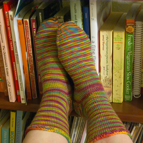 It took me forever to knit these. I worked on them in the car drives to and from Spokane. I finally finished them when I was visiting my mom earlier this month. They are basic toe-up socks in stockinette stitch with a heel flap. Nothing fancy. I think this is my favorite sock pattern. It is so brainless and easy and relaxing. I actually kind of think they turned out o.k. Not as tacky as I thought they would be. I would never wear something like this on any other part of my body, though. Here is the Ravelry link if you want the details on this project.