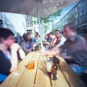 The day before WPPD I and the gang from Pinhole Obscura took the train into Rotterdam to meet Inge and her husband Remko. She gave us a fabulous tour of her town on King’s Day. Here we are drinking beer under an umbrella. Pinhole shot: Zero 2000 + Ektar 100 @