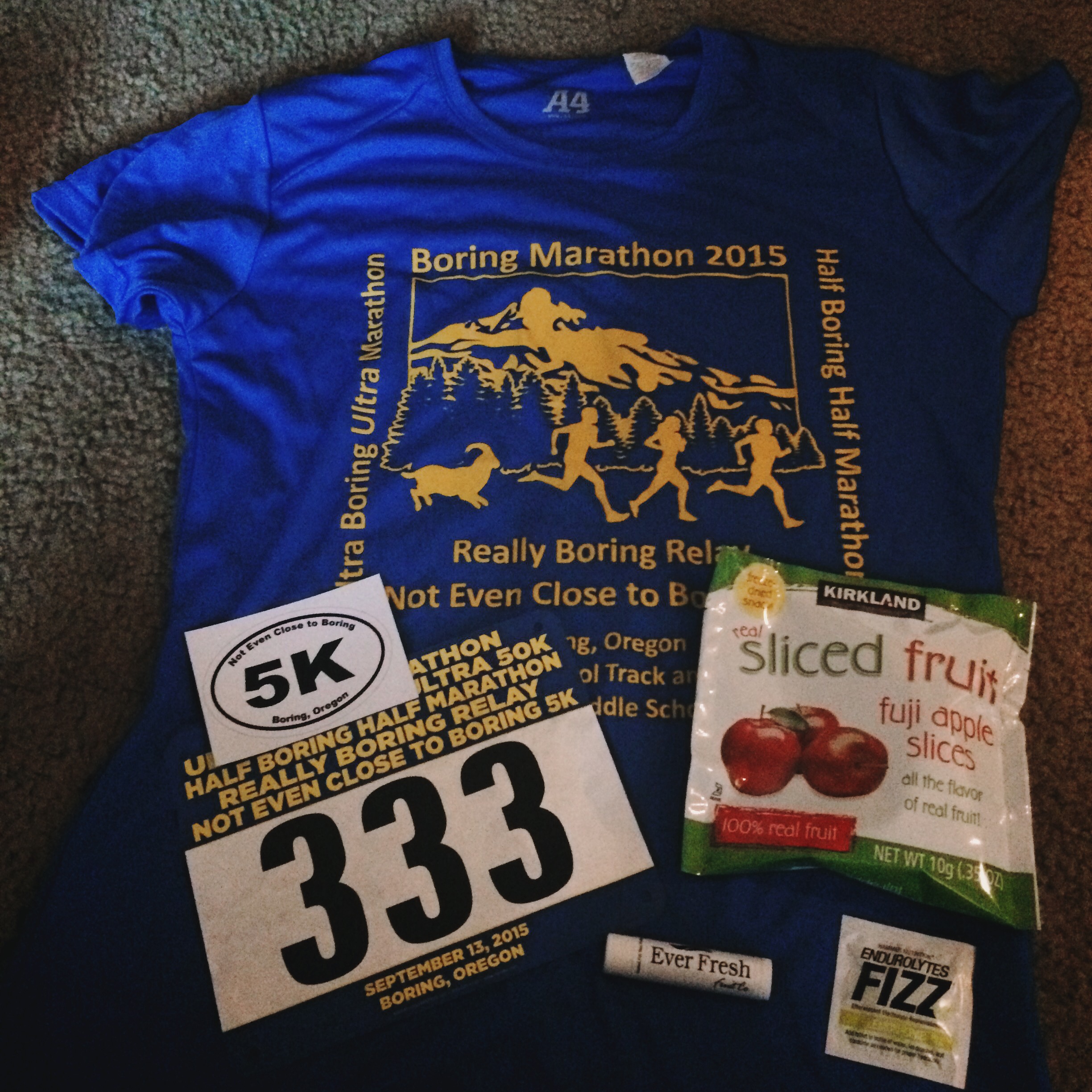 the names are amusing: “Boring Marathon“, “Ultra Boring Ultra Marathon”, “Half Boring Half Marathon”, and the “Not Even Close To Boring 5k”. Rafael ran the Ultra Marathon (30k) and I ran the 5k – another fact I found amusing.